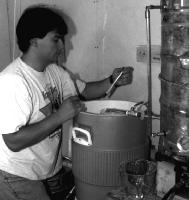 Figure 105: Maintenant l’ébullition est terminée et il est temps de refroidir le moût. Joe Brewer immerge un grand serpentin de refroidissement pour refroidir les gallons de moût.